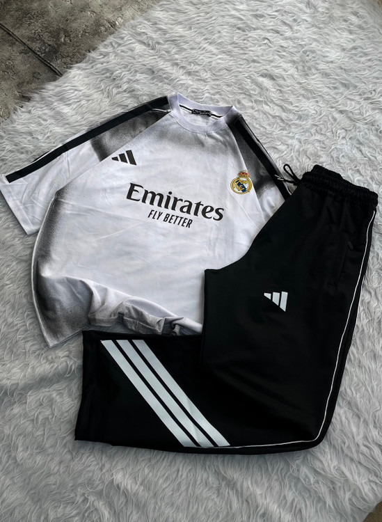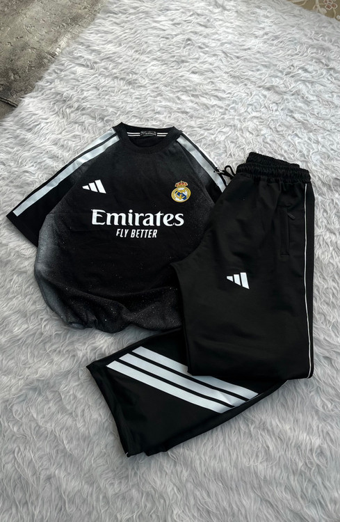 ست تیشرت و اسلش هواداری الهامگرفته از باشگاه افسانهای رئال مادرید (Real Madrid) با طراحی مینیمال و شیک، دقیقاً همون چیزیه که استایل روزمرهتو چند سطح بالاتر میبره. ترکیب لوگوی رسمی، طراحی حرفهای برند آدیداس (Adidas) و اسپانسر معروف امارات (Emirates) حس یک لباس اورجینال فوتبالی رو کامل منتقل میکنه.
