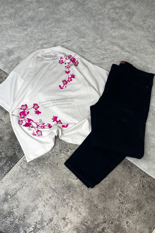 این تیشرت طرح گلهای صورتی و نوشتههای الهامبخش، حس آرامش و تازگی به شما میدهد.